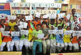[image1] 埃塞俄比亚首都亚的斯亚贝巴AlemMaya小学的学生们面带笑容在“感谢小图书馆”举起写有“感谢朝鲜日