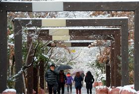 [image1] 废弃铁路边散步路上种满了行道树。积雪的四角拱门下人们穿梭而过。铁路上的两节废弃火车车厢被改造成温馨的