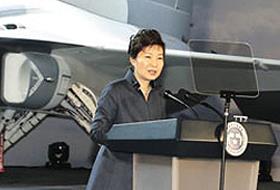 韩国总统朴槿惠17日出席在庆尚南道泗川市韩国航空宇宙产业公司(KAI)举行的“美国出口型教练机(T-X)公开纪念活动”,