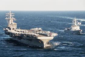 28日,韩美海军在韩国东海上举行联合军演,里根号航空母舰(USS Ronald Reagan CVN-76)(左)和世宗