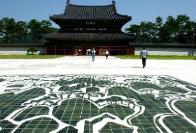 9月28日下午,忠清南道夫余郡夫余邑古德来(音)码头上大批游客登上黄布帆船。船在白马江逆流而上,到落花岩后每个人都争先恐