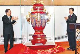 当地时间27日,中国国家主席习近平在纽约出席中国向联合国赠送“和平尊”仪式。联合国秘书长潘基文出席。 习近平在仪式