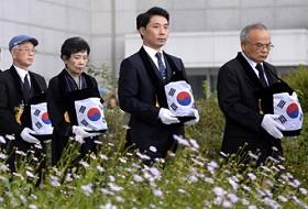 10日下午,日本殖民统治时期被强征至俄罗斯萨哈林地区劳役的13名韩国牺牲者遗骨通过仁川机场被运回韩国,家属们在机场领回亲