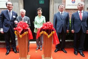 [image2] 韩国总统朴槿惠4日访问上海大韩民国临时政府旧址,出席旧址重新开放仪式,进行了剪彩。 朴槿惠在致