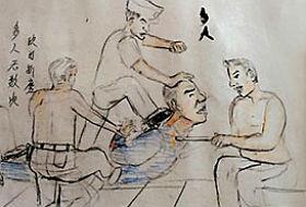 警察们将双手被绑在身后的一名男子按在地上,轮流用脚踢。还将他吊在天花板上,用铁棍电击。有时还用热水从他的头上浇下去,或者