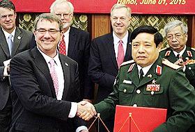美国防长官阿什顿·卡特1日(当地时间)访问越南河内,同越南国防长官冯光青举行会谈,并签署强化两国防卫合作文件。 两