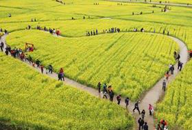 4月5日植树节,在韩国釜山市江西区大渚生态公园,很多市民和幼儿园小朋友们正走在油菜花田里。大渚生态公园拥有韩国最大面积的
