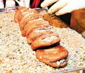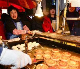 4日下午3时许,在釜山国际市场罐头市场的鱼丸店密集区,有10多家鱼丸店聚集在这条街上。街上挤满了手里拿着鱼丸边走边吃的人