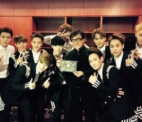 韩国偶像男团EXO和巨星成龙的合照公开。 SM TOWN16日在官方微博上传EXO和成龙在金唱片奖休息室内的合照。