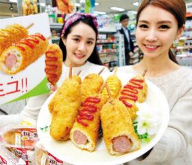15日,7-Eleven便利店首尔小公洞内,模特们正在展示热狗的改良食品。该食品外表和热狗并无差异,里面包着米饭,香肠和