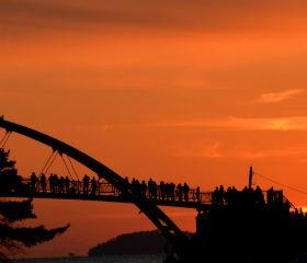 [image2] 日落的光芒染红了韩国西海安眠岛的花地海水浴场,人们登上花桥眺望大海。在花桥后,“老奶奶石头”静静矗立