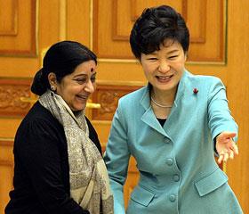 韩国总朴槿惠29日下午在青瓦台接见印度外长斯瓦拉吉。斯瓦拉吉为出席当天在首尔举行的第8届韩国-印度外长共同委员会会议而来