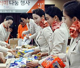 22日,首尔江西老人综合福利馆内,济州航空的乘务员和员工们正在包装“幸福礼包”,这些礼包里装着各种生活用品,为了送给该地
