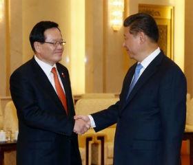 中国国家主席习近平18日在北京人民大会堂接见了正在访问中国的韩国国会议长郑义和。图为两人正在握手。习近平主席表示:“中国