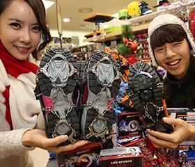 [image1] 8日上午,在首尔市中区蓬莱洞乐天玛特的首尔站分店内,模特们正在展示冰面、雪地防滑器械——冰爪。乐天玛