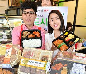 26日,位于首尔江南区的7-Eleven KT江南店内,模特们正在展示色香味俱全的盒饭。出售盒饭等食物的“7-Ele