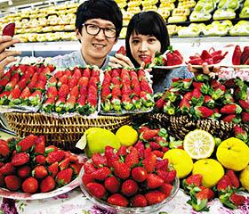 [image1] 4日,韩国农协流通的员工在首尔瑞草区农协Hanaro Club超市良才分店展示今年秋季收获的草莓。这