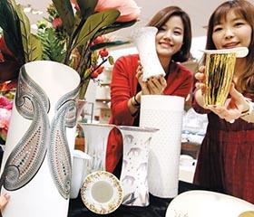 图为2日,在首尔中区小公洞乐天百货店内,员工正在展示美丽的花瓶。这些花瓶是商家携手施华洛世奇共同推出的商品,装饰有水晶原