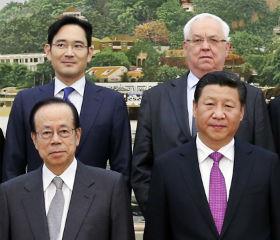 中国国家主席习近平29日在北京人民大会堂接见了博鳌论坛理事团,三星电子副总裁李在镕(上排左)为理事团理事。习主席表示:“