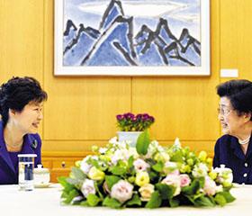 韩国总统朴槿惠28日在青瓦台接见了前总统金大中的夫人李姬镐女士。这是去年2月举行朴槿惠就职仪式后两人第一次见面。