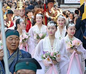 [image2] 23日下午首尔钟路区仁寺洞街头,庆南金海郡的人们装扮成古代伽倻的金首露王,许皇后和七仙女,走上街头,