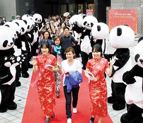 29日,新世界百货店总店举行了欢迎中国游客国庆长假(10月1日-7日)赴韩旅游的活动。图为中国游客和留学生在员工扮成的熊