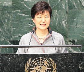 韩国总统朴槿惠当地时间24日在美国纽约举行的第69届联合国大会上发表主题演讲说:“韩半岛统一是无核世界的起点,人权问题的