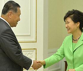 日下午,韩国总统朴槿惠在青瓦台会见到访的日本前首相森喜朗。韩国总统朴槿惠19日下午在青瓦台会见日本前首相森喜朗,森喜朗向
