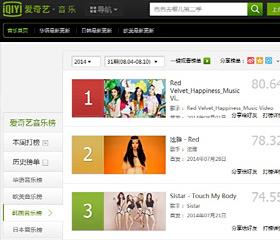 SM娱乐旗下新女团Red Velvet的出道歌曲《Happiness》MV在中国视频网站爱奇艺的MV周排行榜 (8月4日