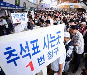 韩国铁路公司从12日上午起开始预售中秋火车票。图为,人们为了购买火车票在首尔火车站候车厅里排起了长龙。