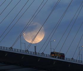 10日晚,在香港的大桥上空出现满月。这次出现的月亮是一年中最大最圆的“超级月亮”。 /美联社