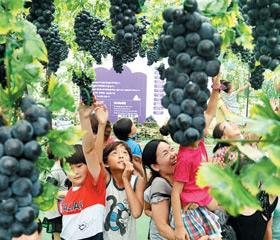 8月8日是“葡萄日”。一串一串葡萄悬挂在城市中心。7日,农协中央会和韩国葡萄生产者协议会为提高葡萄销量在首尔清溪广场举办