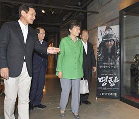 6日,韩国总统朴槿惠在首尔一家影院观看了今夏热门大片《鸣梁》。该片讲诉1597年壬辰倭乱时期,李舜臣将军引领的“鸣梁大捷
