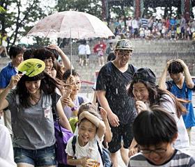 31日下午,首尔突降阵雨,图为在首尔南山塔游览的市民们到处躲雨的样子。当日,首尔最高气温已经达到34.4度,受不稳定大气