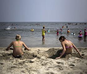 29日,参加国家青少年夏令营的世界各国的年轻人和学生在北韩元山松涛园海边尽情享受海水浴的快乐。虽然从三十年前开始共产主义