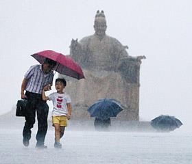 22日下午,暴雨侵袭,在首尔光化门广场市民们拿着雨伞艰难地前行。当日下午5点左右在首尔及周边地区暴雨来袭。下午9点,气象