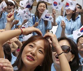 16日上午,来自全球60个国家和地区的韩国语老师访问首尔,聚集在光化门广场,在世宗大王铜像前挥动国旗合影留念。此次访问韩