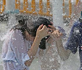 10日下午,在首尔纛島户外游泳池喷泉,年轻人在玩水嬉戏。当天,白天最高气温已迅速蹿升到33摄氏度,首尔京畿道地区已发布热
