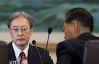 1日上午,日本外务省亚洲大洋洲局局长伊原纯一(左)和北韩的北日邦交正常化谈判大使宋日昊在中国北京北韩驻中国大使馆举行了两