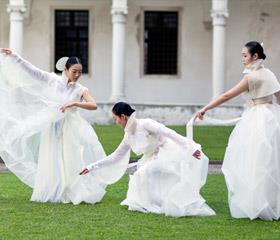 18日,意大利威尼斯举行韩国编舞家赵龙民(音)的演出“The Bridging Colours-White”。演出中,舞