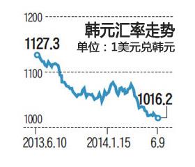 韩元一路飙升至爆发全球金融危机之前的水平,严重影响出口企业效益。 9日,在首尔外汇市场韩元兑美元汇率以1016.2