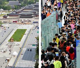 4日上午,首尔中区世宗大路迎来6.4地方选举和连休假期,显得空荡荡(左图)。与此相反,仁川国际机场(右图)大量旅客,人满