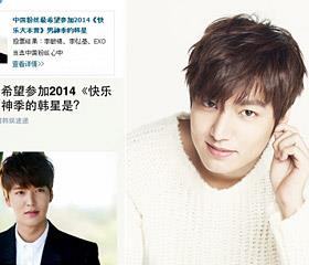 韩国演员李敏镐当选中国粉丝心中最希望参加2014《快乐大本营》(简称《快本》)男神季的韩星,再度证明了其作为“韩流第一男