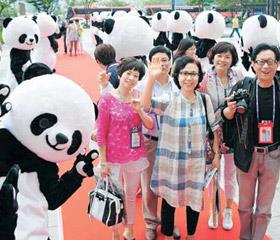 图为,2日下午在釜山新世界百货商店前,身穿“熊猫”服装的职员们迎接中国游客。他们是当天乘坐豪华游轮抵达釜山港的。当天有三