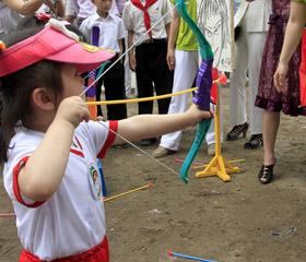 6月1日,迎接“六一”国际儿童节,北韩的孩子们也参加各种庆祝活动。图为,平壤的一名女童正在向美国总统奥巴马形象的靶子射箭