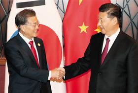 据青瓦台方面12日消息称,韩国总统文在寅和中国国家主席习近平11日在APEC(亚太经合组织)领导人非正式会议举办地越南岘