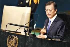 当地时间21日,韩国总统文在寅在纽约联合国总部召开的第72届联合国大会上发表基调演讲,向国际社会阐明了自己关于解决朝核问