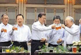 27日,韩国总统文在寅在青瓦台会见了现代汽车副总裁郑义宣、LG副总裁具本俊、POSCP总裁权五俊、韩华副总裁金春洙、新世