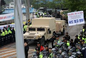 26日上午,装有萨德相关装备的拖车正驶入庆尚北道星洲高尔夫球场。 26日,随着驻韩美军突击携萨德(THAAD,末段