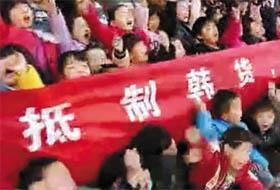 本月10日,中国微博上有人上传了一段小学生们在学校进行批判韩国和乐天大会的视频。聚集在礼堂里的小学生们跟着教师的引导,高